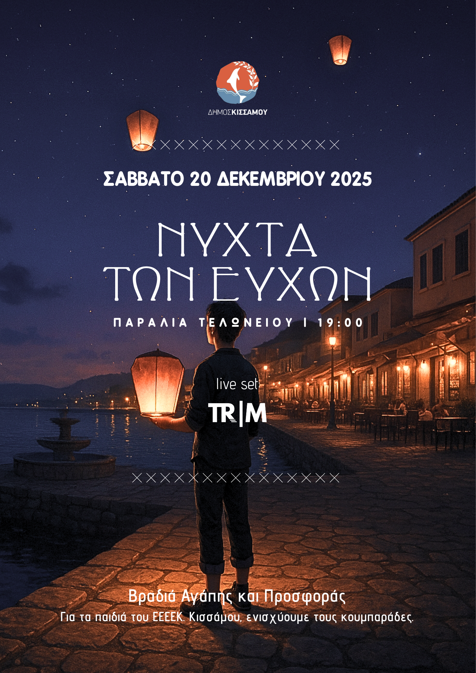 Το Σάββατο 20 Δεκεμβρίου και ώρα 19:00, στην παραλία δίπλα από το Δημοτικό Στάδιο Κισσάμου, μικροί και μεγάλοι καλούνται να συμμετάσχουν στη «Νύχτα των Ευχών», ένα μοναδικό χριστουγεννιάτικο υπερθέαμα γεμάτο φως, συγκίνηση και προσφορά.