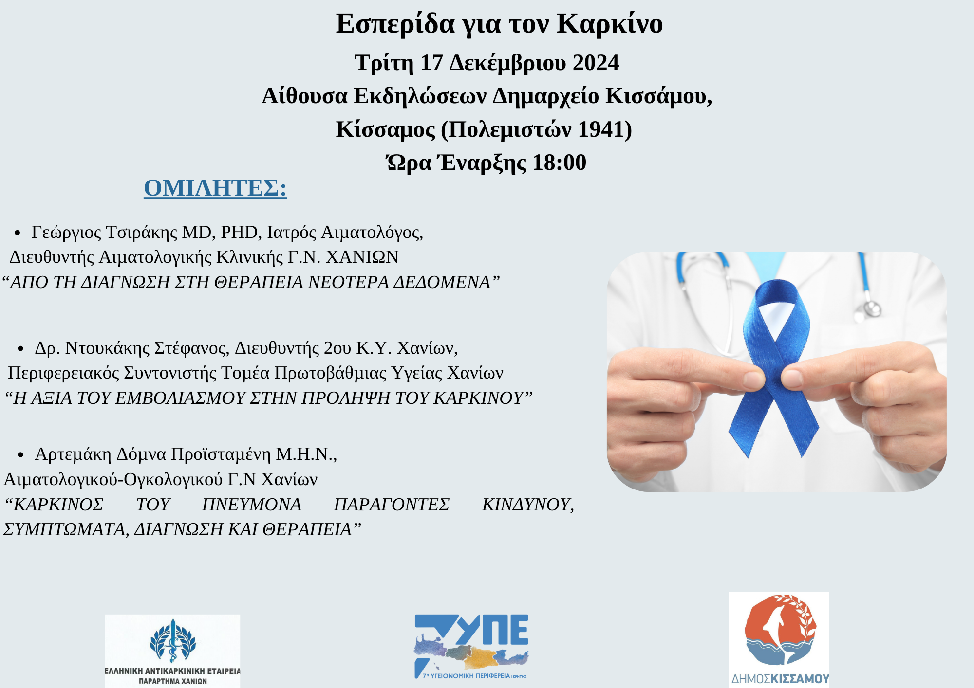 Την Τρίτη 17 Δεκεμβρίου 2024 και ώρα 18:00 το απόγευμα, στην αίθουσα εκδηλώσεων του Δημαρχείου Κισσάμου στα Χανιά, θα πραγματοποιηθεί ανοιχτή για το κοινό, επιστημονική ενημερωτική εκδήλωση για τον καρκίνο. Την εσπερίδα διοργανώνουν η Ελληνική Αντικαρκινική Εταιρεία- Παράρτημα Χανίων και η 7η Υγειονομική Περιφέρεια Κρήτης, σε συνεργασία με τον Δήμο Κισσάμου.