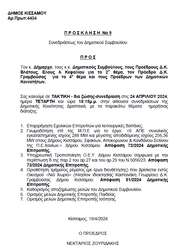 ΠΡΟΣΚΛΗΣΗ 9/2024 ΔΗΜΟΤΙΚΟΥ ΣΥΜΒΟΥΛΙΟΥ ΚΙΣΣΑΜΟΥ & ΑΛΛΑΓΗ ΩΡΑΣ ΣΥΝΕΔΡΙΑΣΗΣ