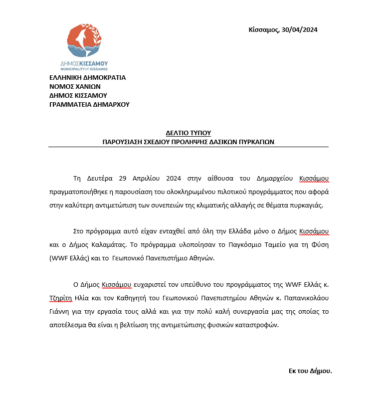 O Δήμος Kισσάμου γνωστοποιεί ότι τη Δευτέρα 29 Απριλίου 2024 στην αίθουσα εκδηλώσεων του Δημαρχείου και ώρες 18:00-20:00 θα πραγματοποιηθεί η παρουσίαση του σχεδίου πρόληψης πυρκαγιών.