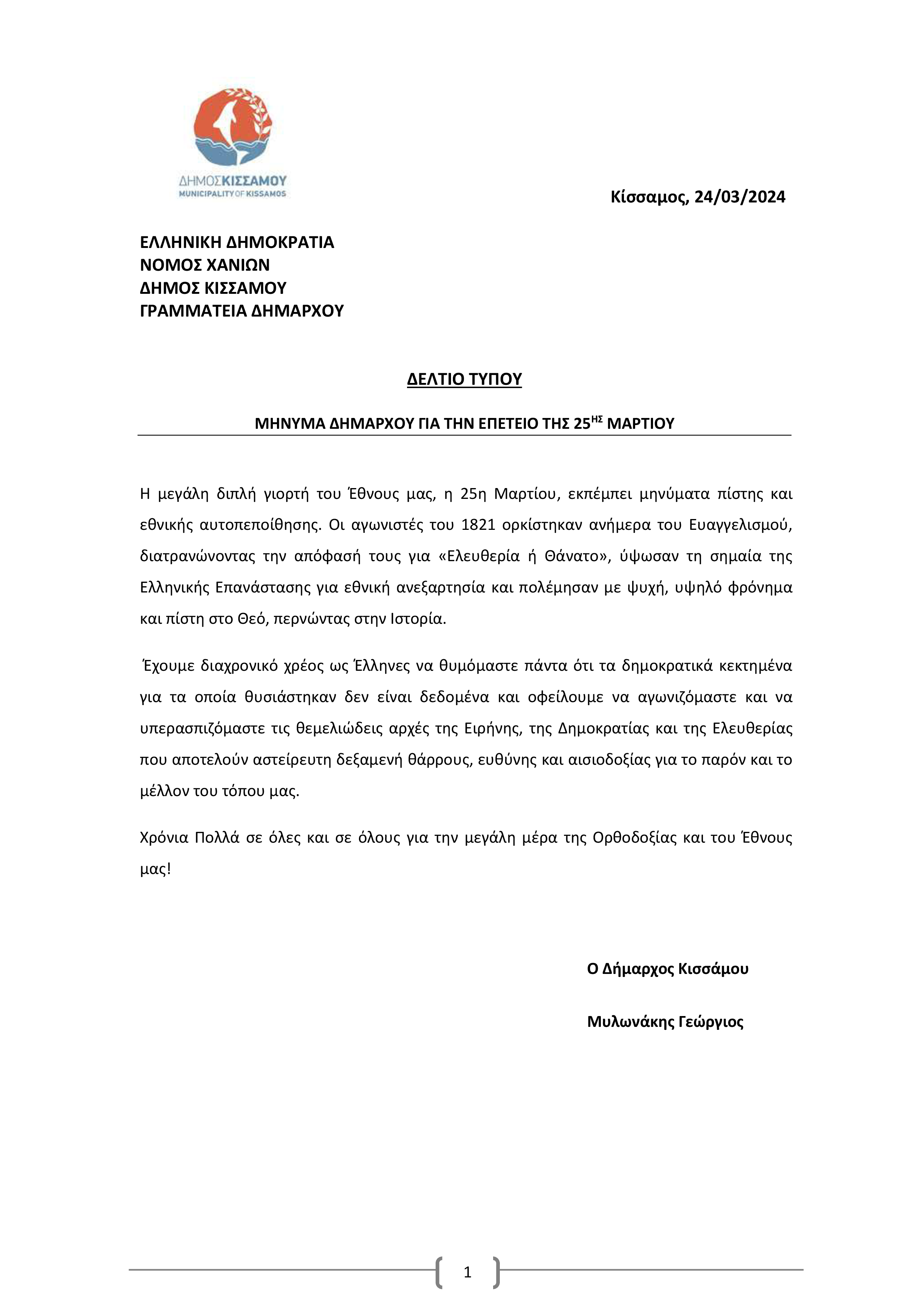 ΕΛΛΗΝΙΚΗ ΔΗΜΟΚΡΑΤΙΑ Κίσσαμος 29-3-2024