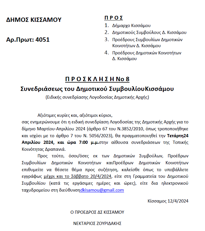 ΕΛΛΗΝΙΚΗ ΔΗΜΟΚΡΑΤΙΑ Κίσσαμος 11-4-2024