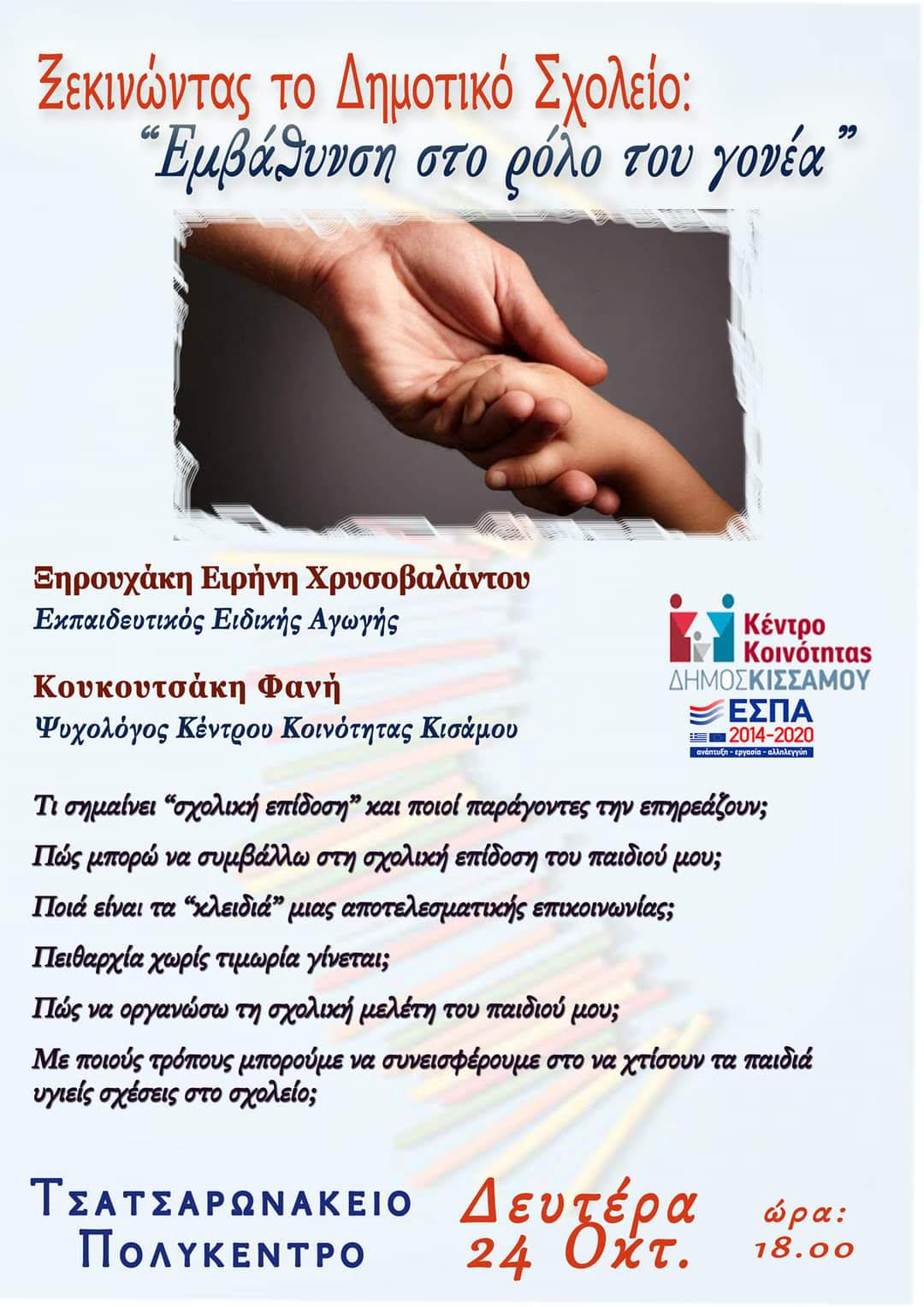 ΔΕΛΤΙΟ ΤΥΠΟΥ Eνημερωτική συνάντηση γονέων με θέμα: 'Οριοθέτηση και κανόνες στο σπίτι και το σχολείο/ Πειθαρχία χωρίς τιμωρία'