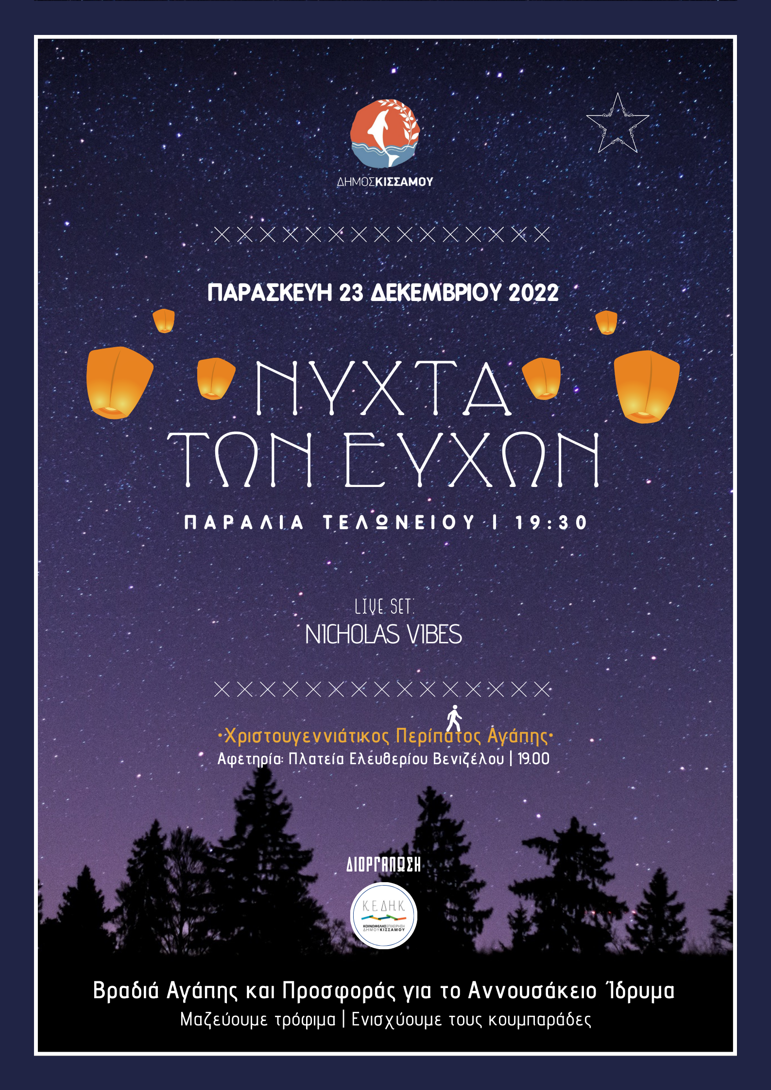 Συνεχίζονται οι Χριστουγεννιάτικες εκδηλώσεις στο Δήμο Κισσάμου με την πιο μαγευτική νύχτα των Χριστουγέννων, τη Νύχτα των ευχών, ένα μοναδικό υπερθέαμα έρχεται και πάλι στην Κίσσαμο, την Παρασκευή 23 Δεκεμβρίου και ώρα 7:30 στην παραλία δίπλα από το Δημοτικό Στάδιο Κισσάμου .