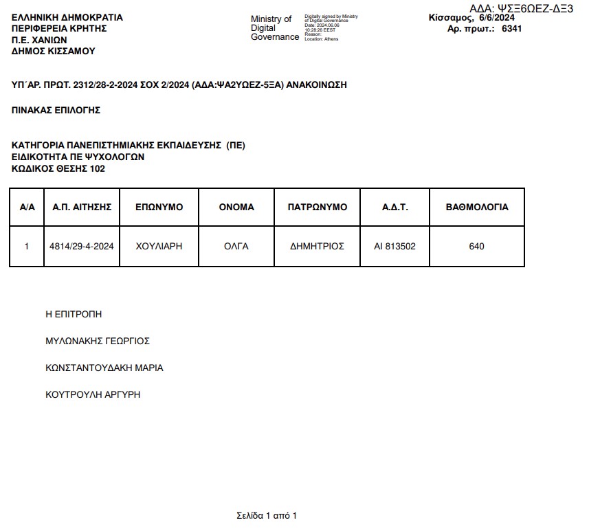 Ο Δήμος Κισσάμου ανακοινώνει την δημοσίευση των Πινάκων Κατάταξης & Βαθμολογίας, των Πινάκων Επιλογής, καθώς και των Πινάκων Απορριπτέων υποψηφίων, ειδικότητας ΔΕ Διοικητικού / Λογιστικού της υπ'αρ.πρωτ. 4889/30-4-2024 ΣΟΧ 3/2024 Ανακοίνωσης.